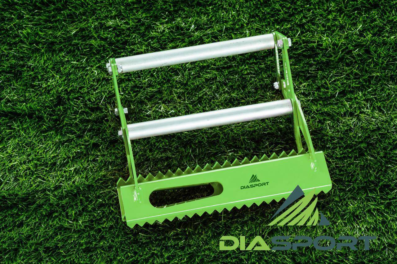 Зажим для искусственного газона является базовым инструментом при монтаже футбольных полей. Для инсталляции покрытий и в особенности стыковки полотен газона требуются колоссальные усилия в натяжении/перемещении/смещении покрытия, т. к. вес рулонов порой достигает 500 кг. Эту задачу решает зажим для искусственной травы. Благодаря зубчатым полотнам и уникальной конструкции инструмента достаточно просто зафиксировать и сместить газон. За удобные алюминиевые рукоятки можно взяться обеими руками. Зажимы от DiaSport позволяют распределять усилия и избежать боли в суставах рук и стертых пальцев.